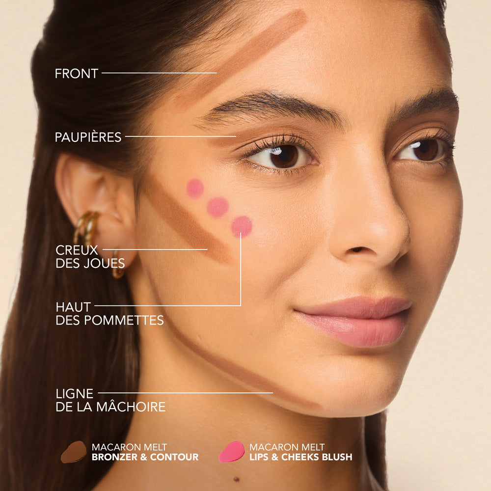 Grâce à sa texture crème-poudre, le bronzer & contour Macaron Melt se travaille facilement, et se module sans effet de matière afin d’ajuster l’intensité selon vos envies.